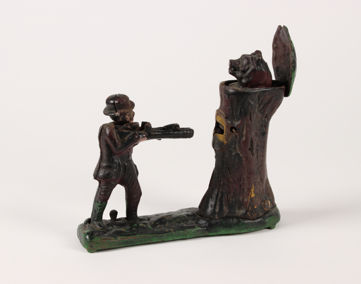 Reproduktion des ab 1907 erschienen Sparautomat „Teddy and the bear“. Dargestellt wird der frühere US-amerikanische Präsident Theodore Roosevelt bei der Jagd auf einen Bären.