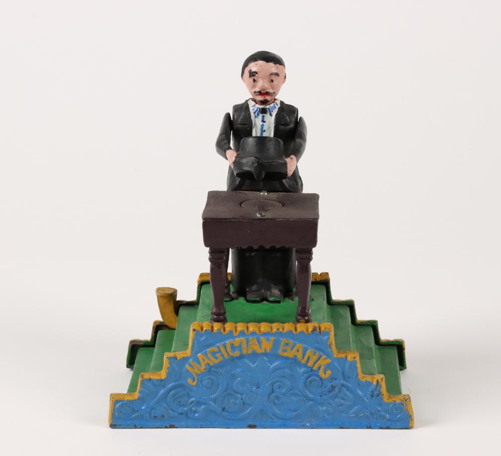 Reproduktion des ab 1900 erschienen Sparautomat „Magician Bank“, der Zauberer lässt die Münze unter seinem Hut verschwinden.