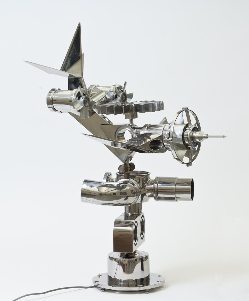 Der Bildhauer Josef Schagerl war anfänglich von einer figurativen Haltung geprägt, die gegen Ende der 1950er-Jahre von einer weitgehend kubischen Formensprache abgelöst wurde. Bei der Arbeit „Das 20. Jahrhundert landet auf dem 19. Jahrhundert“ handelt es sich um eine kinetische, von einem Motor angetriebene Skulptur, welche die Architektur- und Designutopien der späten 1960er-Jahre reflektiert und zugleich die Begeisterung des Künstlers für das Fliegen bzw. für Technik im Allgemeinen bezeugt.