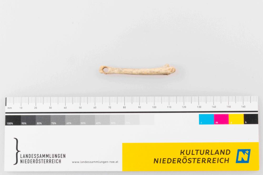 Ein Anhänger aus dem Mittelfußknochen eines Feldhasen. Der Begriff "Anhänger" beschreibt ein Objekt, das offensichtlich an einer Schnur oder Kette befestigt war und in vielen Fällen wohl als Schmuckstück zu klassifizieren ist. In diesem Fall wurde der Knochen am anatomisch gesehen distalen Ende des Gelenks durchlocht, im Bereich einer dort am Knochen natürlich vorhandenen Eintiefung.