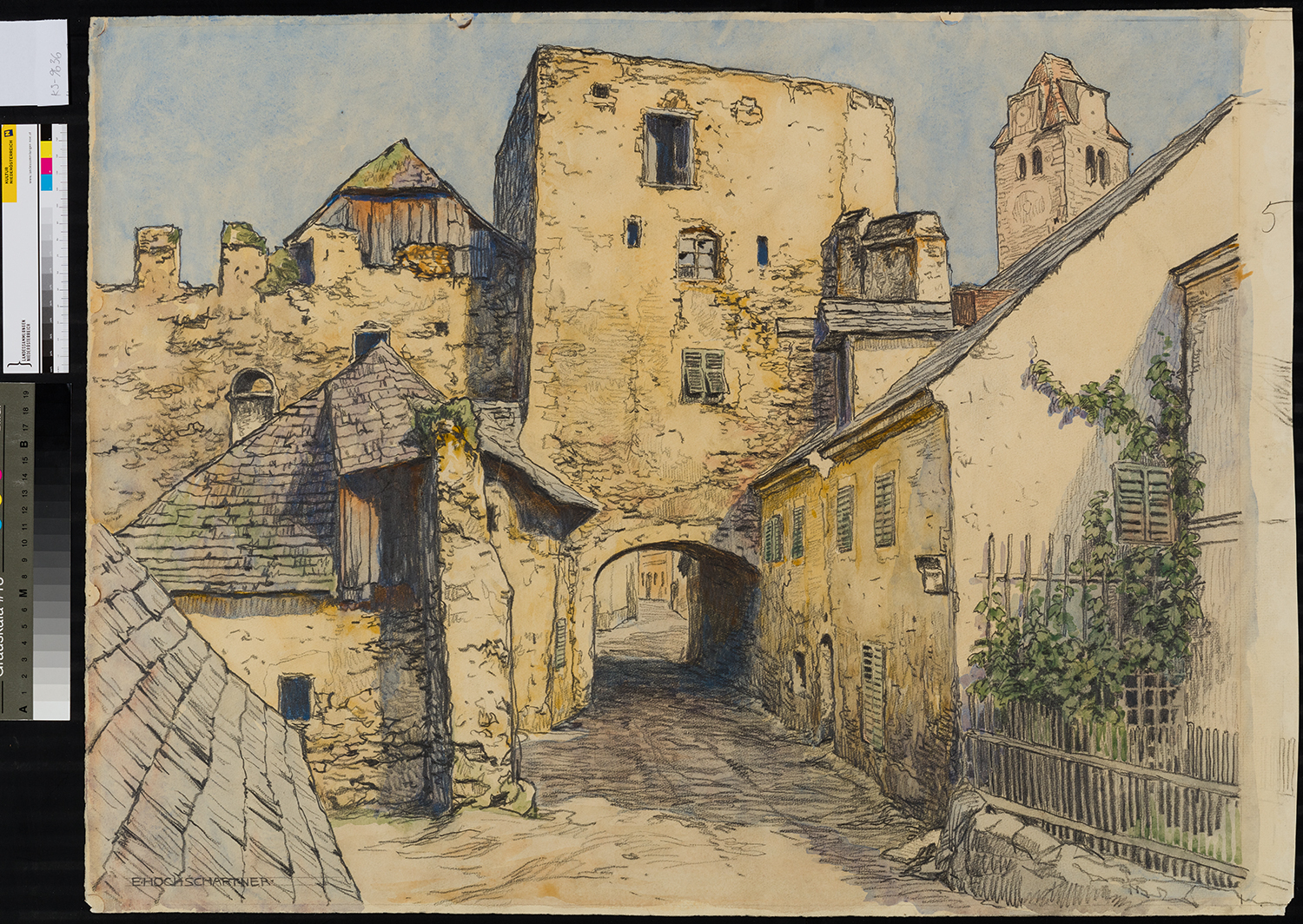 Material/TechnikBleistift, aquarelliert, weiß gehöht auf Papier