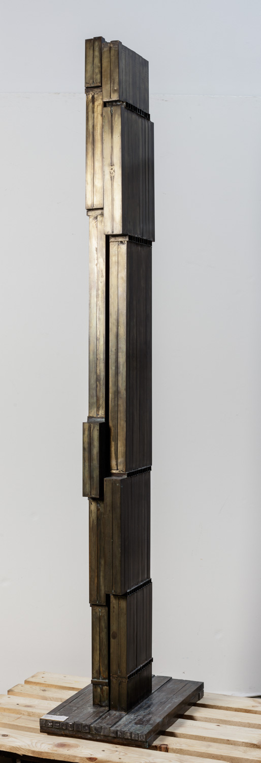 Als Sohn eines Holzschnitzers und wie viele akademische Bildhauer seiner Generation vorwiegend am Akt geschult, war Josef Schagerl anfänglich von einer naturalistisch-figürlichen Haltung geprägt. Noch während des Studiums und forciert durch ein Paris-Stipendium im Jahr 1951, überkam ihn jedoch „Widerwillen gegen abgerundete, allzu biologisch-fleischlich wirkende Konvexformen, die unabwendbar Vergänglichkeit implizieren“, schrieb der Künstler in einem autobiografischen Text. Damit ging die sukzessive Abkehr von den klassischen Werkstoffen der Bildhauerei einher und – ausgelöst durch die Teilnahme am 1. Stahlsymposion im österreichischen Kapfenberg 1961 – eine Hinwendung zu technoiden Materialien der Metallindustrie. Zudem schien ihm der bewusste Verzicht auf die freie Formbarkeit und die Einschränkung auf vorgefertigte Elemente der Zukunfts- und Fortschrittsgläubigkeit der damaligen Zeit angemessen. In den 1960er-Jahren entstand somit eine Reihe von hochaufragenden, schlanken Stelen, zusammengefügt aus Chromnickelstahl-Lamellen oder Vierkantrohren, die, von ausrangierten Messingbetten stammend, Schagerl massenhaft auf Schrottplätzen fand.